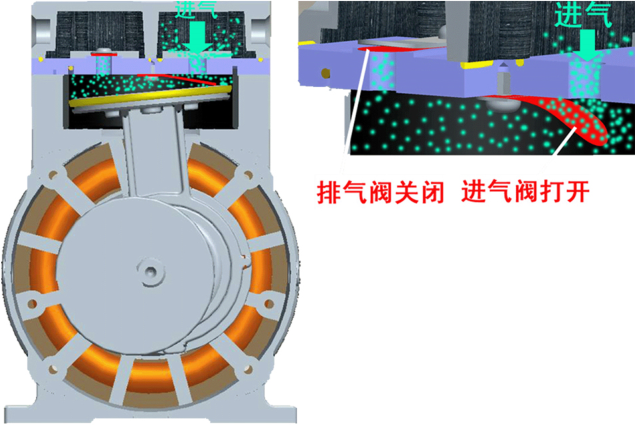 定子進排出口分離開來,周而復始運轉,進行變容,將吸入氣體,從排氣口排出,從而達到抽氣目的。