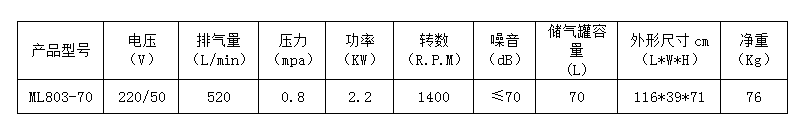 臺冠空氣壓縮機,簡稱空壓機,是工業現代化的產物,ML803-70壓縮機用途非常廣泛,主要表現在用于輪胎充氣、噴漆、潛艇沉浮、沉船打撈、海底石油勘探、氣墊船、食品、制藥工業,利用壓縮空氣攪拌漿液、高壓空氣爆破采煤等等。