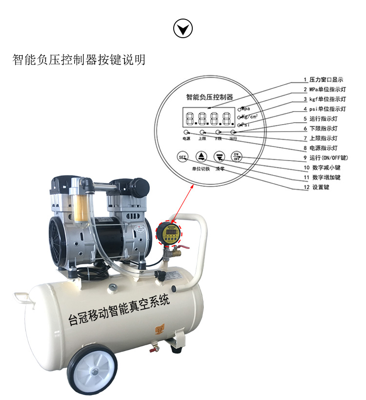 智能壓力控制器:高精度光電原理控制,0-98KPA內自由調節上限(停止),下限(啟動)。